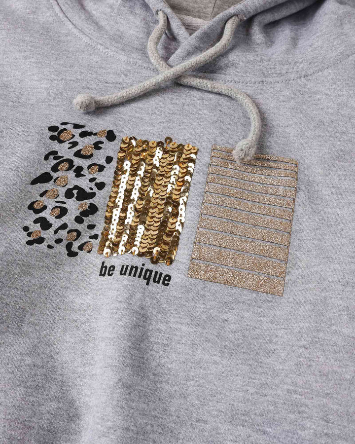 Be unique just like this cool grey kimono hoodie that comes with HD printing and sequins for a blingy effect. The elasticated hem of the hoodie and drop shoulder style with kimono sleeves gives it a baggy look. – Machine wash cold – Fleece – HD Printing – Sequins – Kimono Sleeves – Ribbed Cuffs and Hem – Drop Shoulder - Cropped