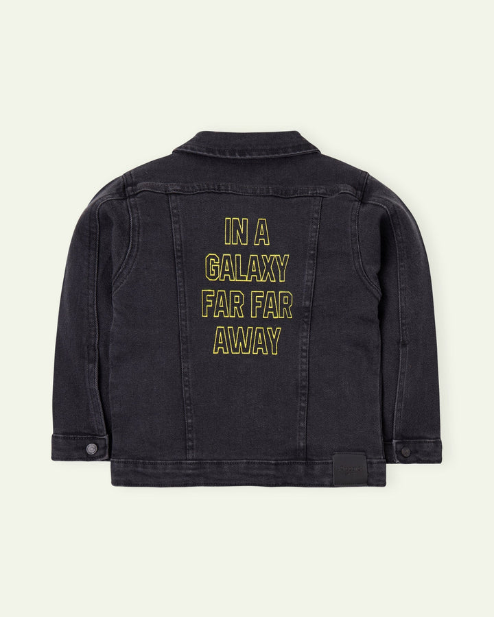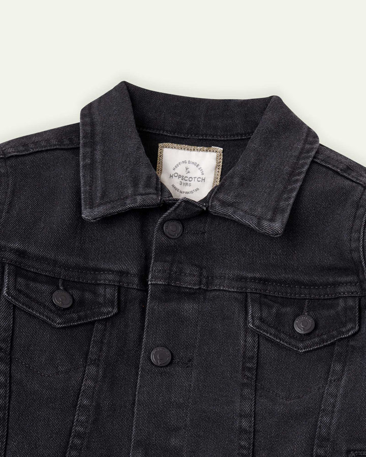 Dress your little dude in cool vibes with this black denim jacket featuring branded snap buttons – it's not just a jacket, it's a style-packed adventure ready for buttoned-up fun! – Printed Text At the Back - Branded Hopscotch Snap Buttons – Front Pockets – Denim – Machine Wash Cold