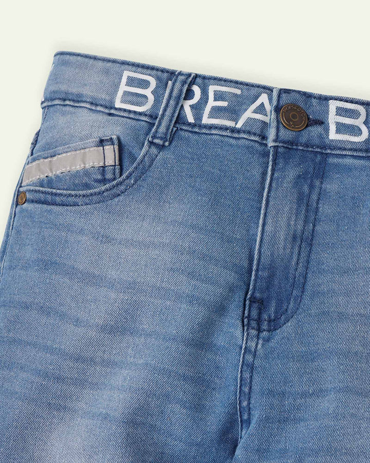 Step into sleek style with our slim-fit jeans featuring a touch of individuality—screen-printed text on the waist adds a trendy flair, while the coin pocket's reflector detail not only catches the eye but also lights up their look with a touch of cool distinction. – Reflector Detail – Slim Fit – Denim – Machine Wash Cold
