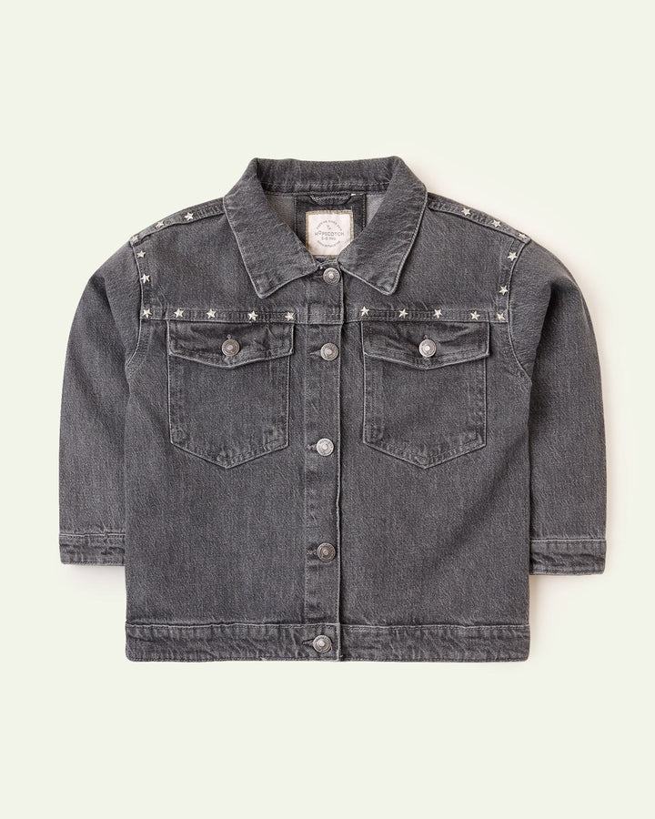 The ultimate fusion of edgy and chic, this embellished grey denim jacket is a wardrobe must. -Denim -Front & Back Yoke -2 Front Flap Pockets -Front Open Placket -Branded Buttons -Embellished -Oversized -Machine Wash Cold