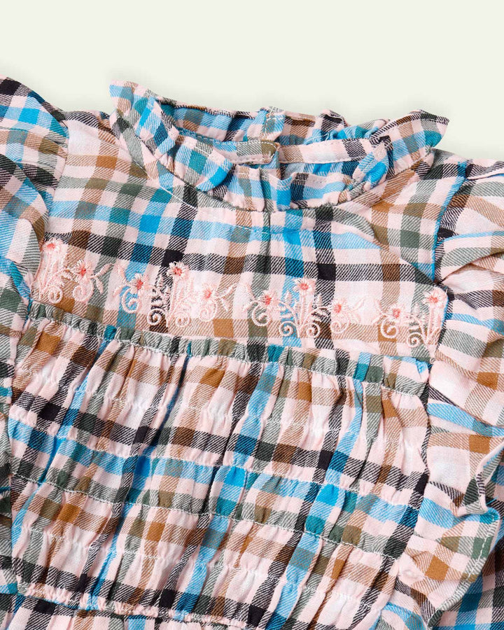 The smocking on the yoke along with ruffles adds character to this check dress. We have also added embroidery for a playful look. – Elasticated Sleeve Hems – Embroidery – Smocking – Ruffles – 100% Cotton – Machine Wash Cold