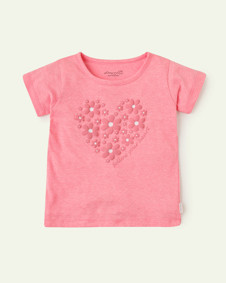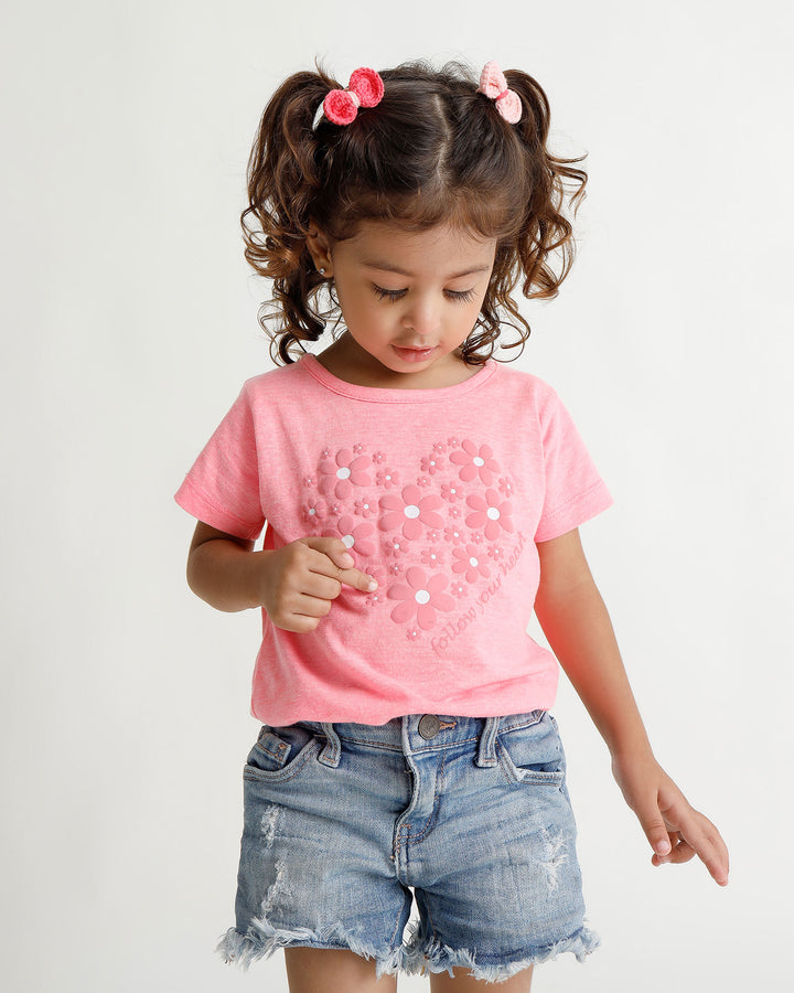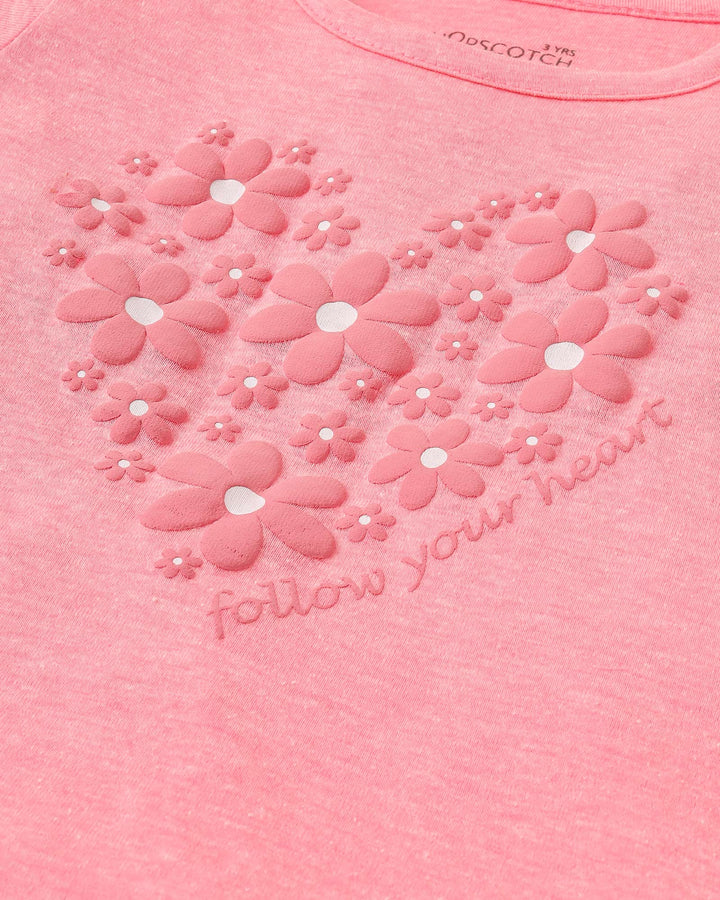 She’ll love the vibrant floral pattern on this pink cotton t-shirt, perfect for expressing her bright and bubbly personality. -100% Cotton -Puff Print -Machine Wash Cold