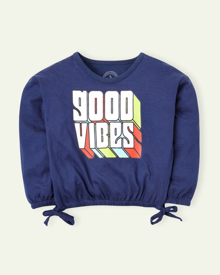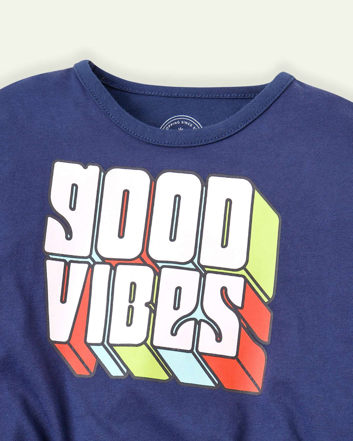 Aim for only good vibes in this soft cotton boxy cropped top with an elasticated waist that gives the t-shirt a baggy look. – Screen Printing – Elasticated Hem and Sleeves – 100% Cotton – Machine Wash Cold