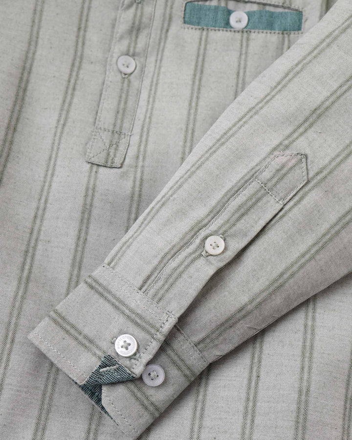 Step up his style game with this striped band collar shirt, featuring branded Hopscotch buttons and a smart front pocket for a dapper twist on casual charm. – Ban Collar – Branded Hopscotch Buttons – 100% Cotton – Machine Wash Cold