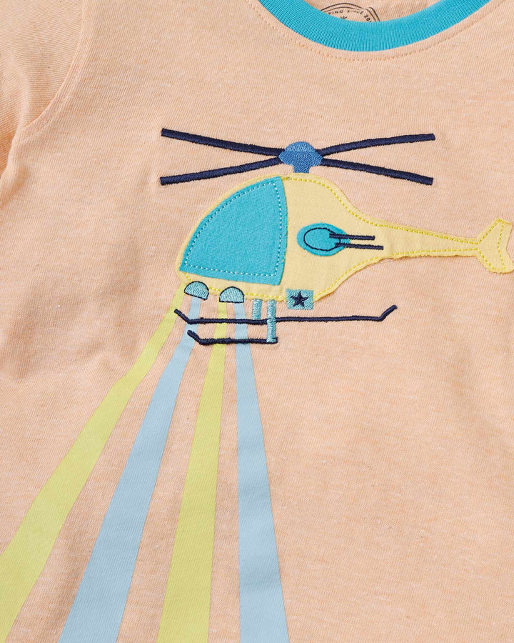 Appliquéd helicopter on a heather jersey will help you find the little treasures in the backyard. – Machine Wash Cold – Heather Jersey – Appliqué