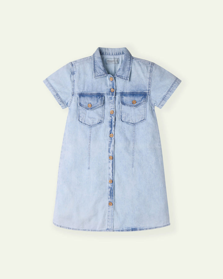 Your little girl will love this light wash denim dress that comes with patch pockets and wooden buttons. – Light wash – Patch Pockets – Wooden Buttons – Denim – Machine Wash Cold