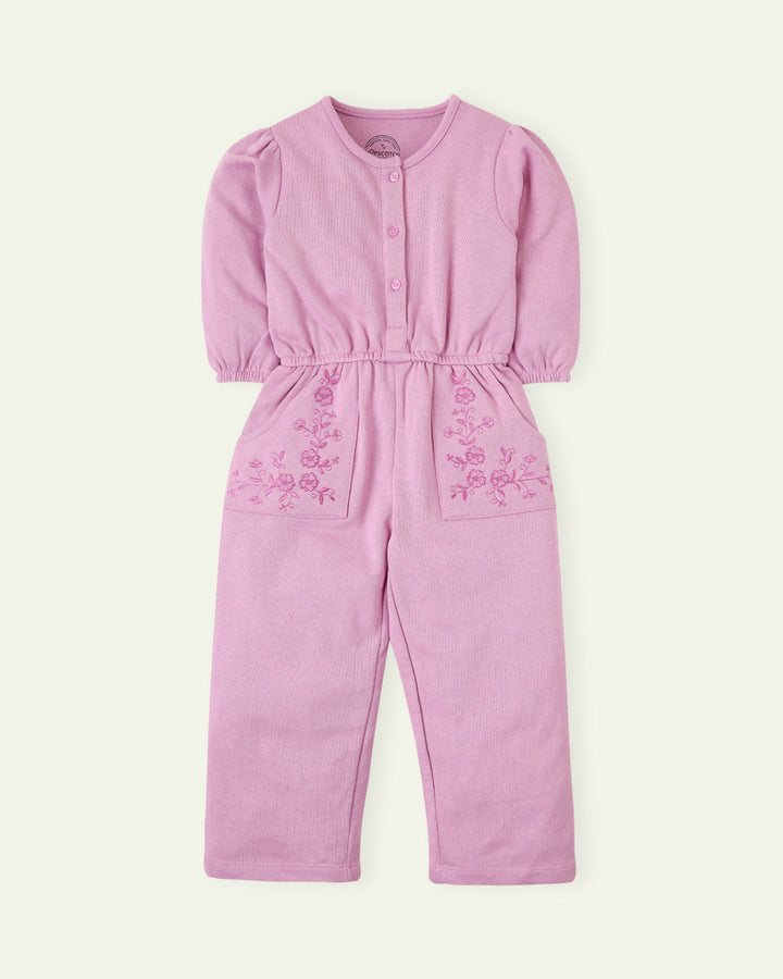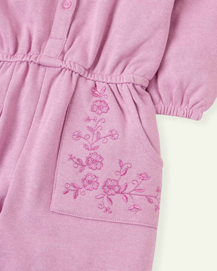 Wrap yourself in the cozy luxury of this terry jumpsuit adorned with delicate embroidery on the hem of the patch pockets. The button-down style above the waist paired with puff sleeves adds cuteness to the overall look. – Embroidery – Branded Hopscotch Buttons – Patch Pockets – Terry – Machine Wash Cold
