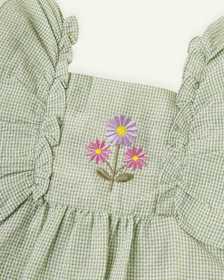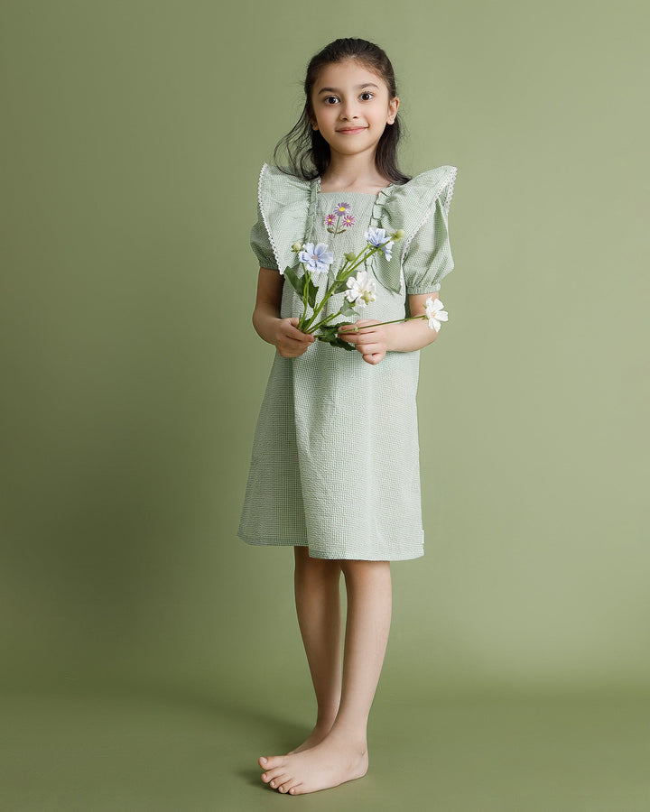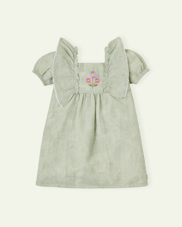 Dress to impress in this embroidered yoke ruffle dress. Green with a hint of lavender makes you want to take this dress out on a stroll. - 100% Cotton - Machine Wash Cold