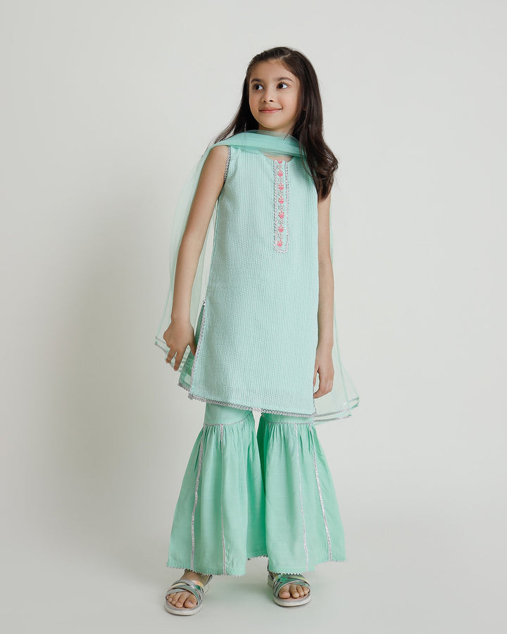 Make memories in this beautiful dress. Placket embroidery with pearl embellishments paired with gharara and matching net dupatta. – Dry Clean Only
