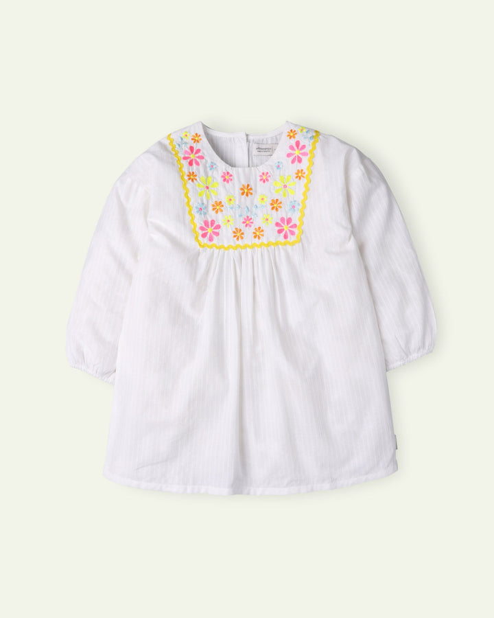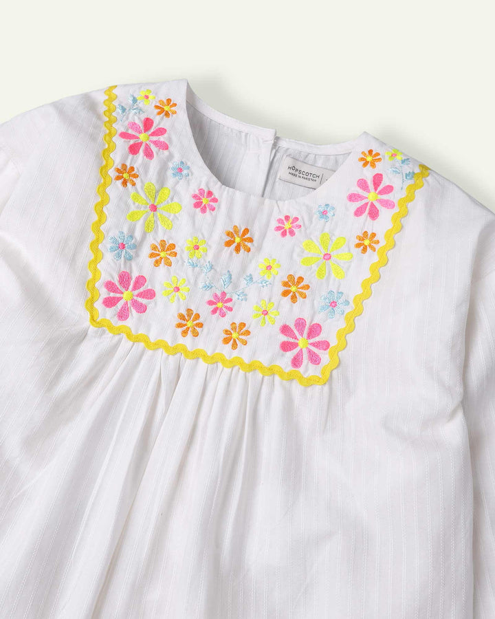 Walk into the summer sun with a bright smile and brighter embroidery! This textured cotton white top has delicate neon floral embroidery on the yoke to accentuate the look. The elasticated sleeves along with a drop shoulder cut add to the cuteness. - Machine wash cold - 100% cotton - Neon Embroidery - Elasticated Sleeves - Drop Shoulder