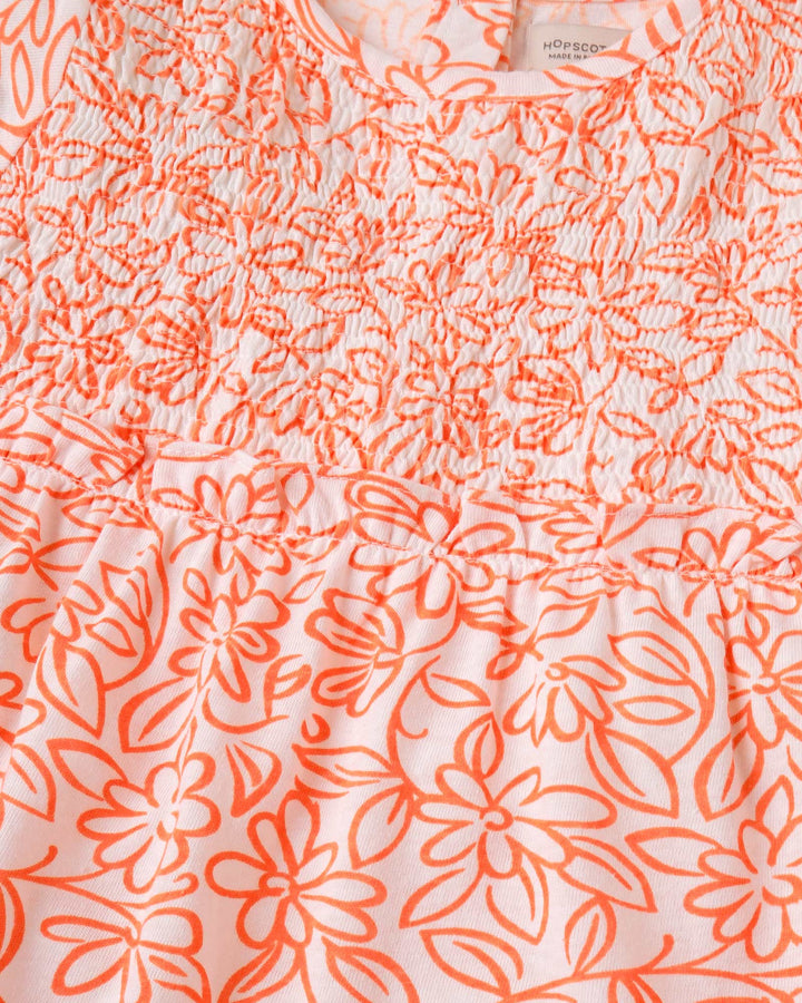 Charming and colorful, this orange floral print dress is perfect for twirling through the fall season. -100% Cotton -Smoking Yoke -Ruffle Bottom Hem and Sleeves -Back Placket Opening -Machine Wash Cold