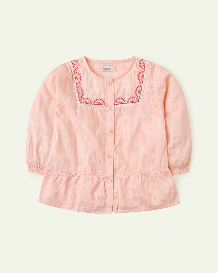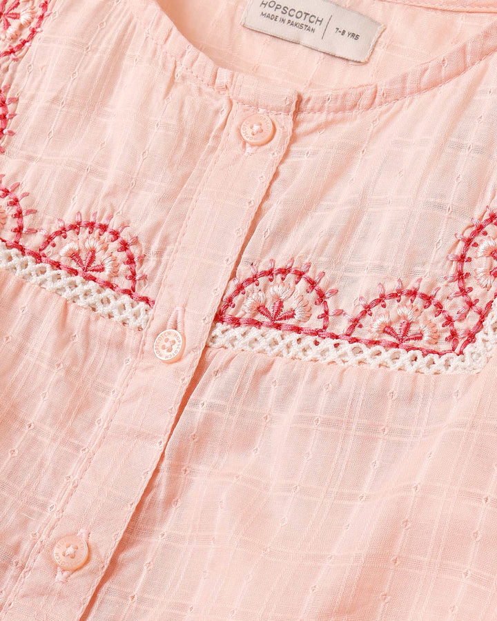 This peach embroidered top will be a delightful addition to her wardrobe, featuring lovely details and a flattering fit. -Dobby Fabric -Embroidered -Front Placket -Elastic Sleeve Hem -Machine Wash Cold