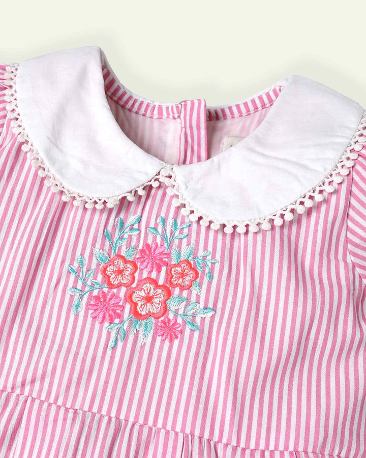 This pink striped dress with neon embroidery is made for kitty party stars! The plain white baby collar with laced details breaks the monotony and adds a special charm to it. – Machine wash cold – 100% Cotton – Neon Embroidery