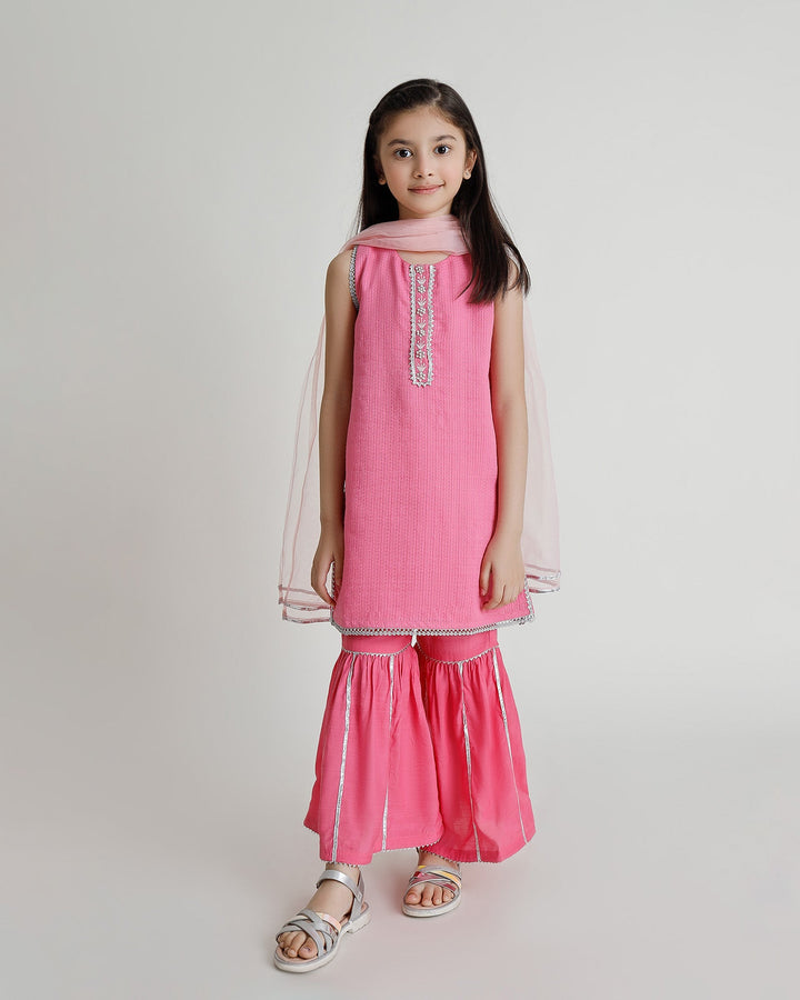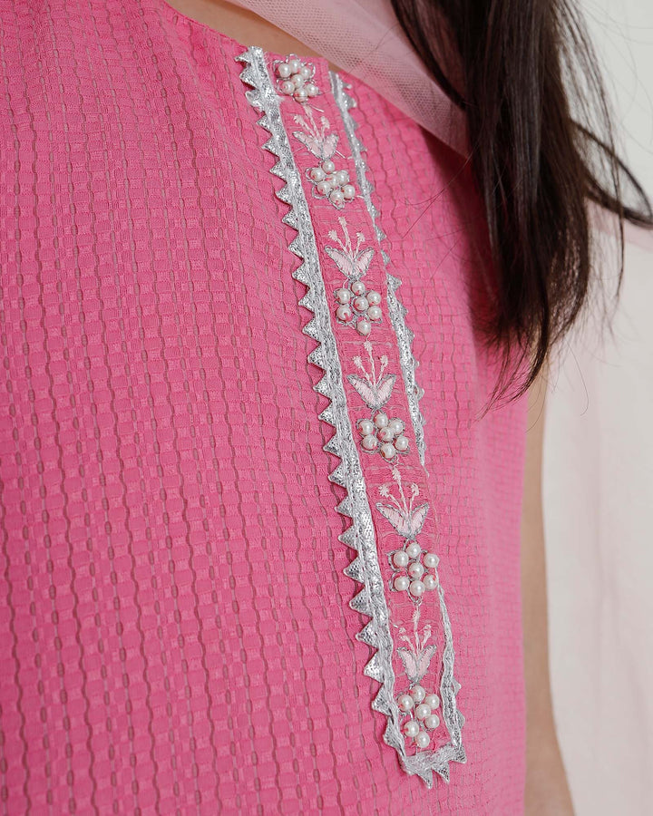 This candy pink dress is giving away barbie feels. Beautiful placket embroidery adorned with pearls and shiny lace details. Paired with a gharara and a net dupatta. – Dry Clean Only