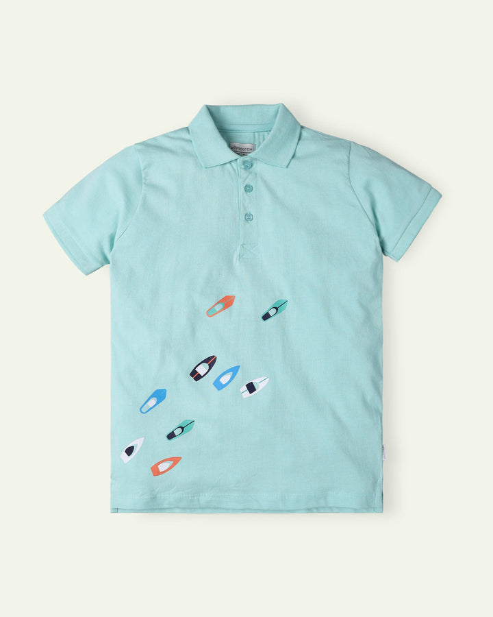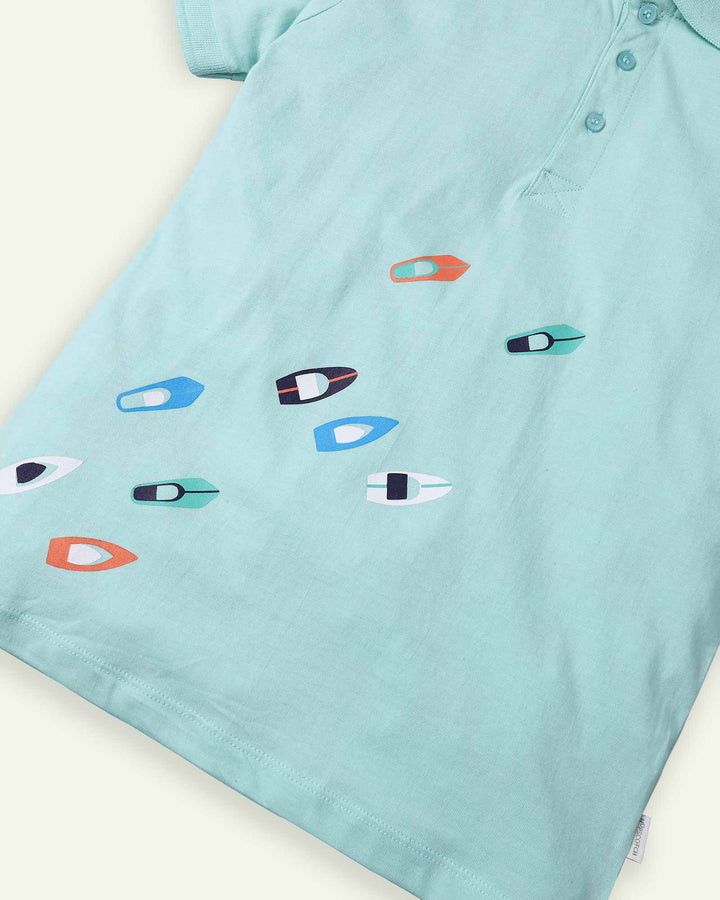 Not your regular polo! It has mini boats screen printed on jersey fabric. - Machine Wash Cold - 100% Cotton - Branded Hopscotch Buttons