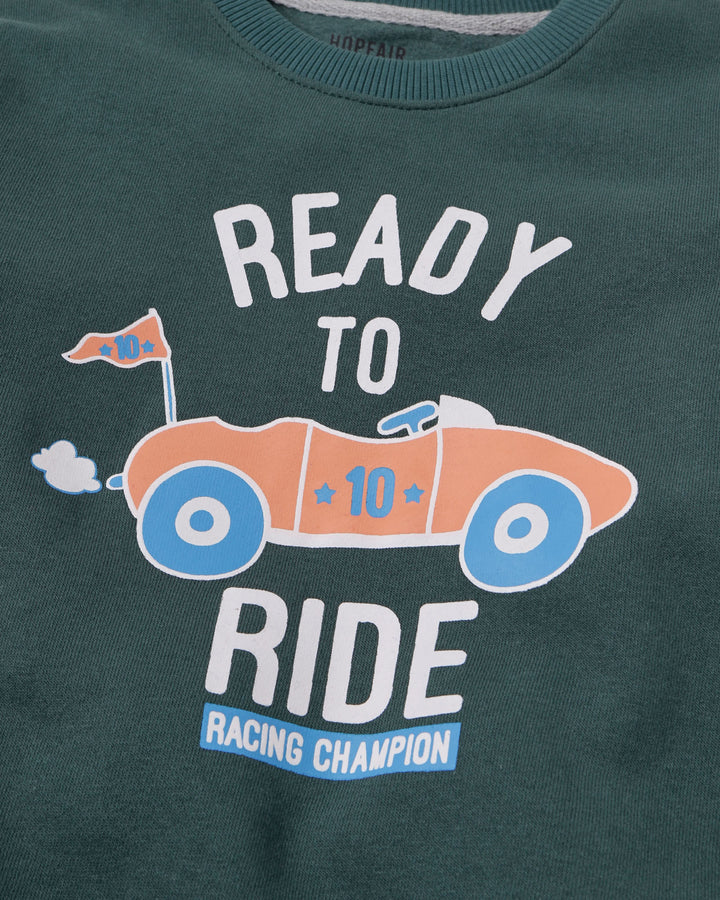A sporty green fleece sweatshirt with fun racing-themed details for little speed lovers. -Fleece -Ribbed Neckline -Machine Wash Cold