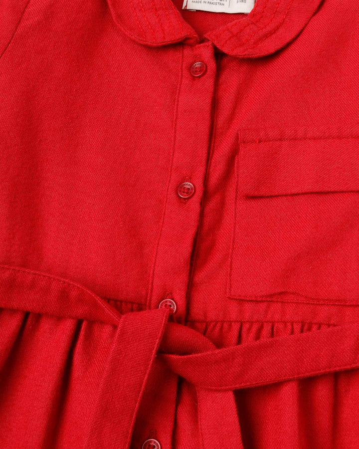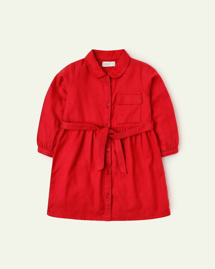 Bright and bold, this red dress is perfect for making a statement. -Cotton -Front Placket -Front Pocket -Baby Collar -Self Fabric Belt -Machine Wash Cold