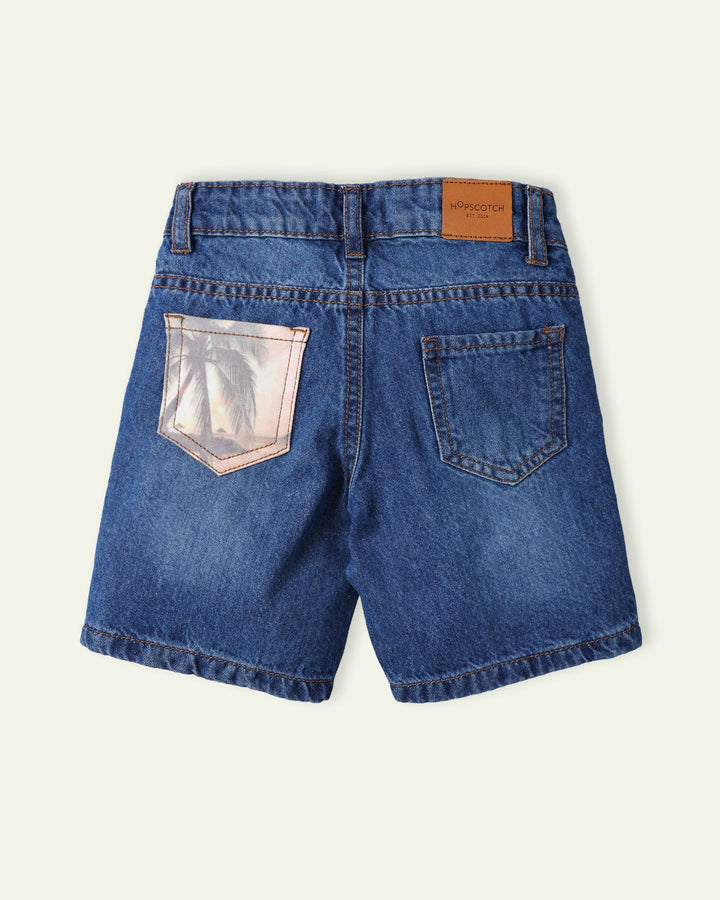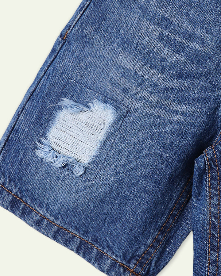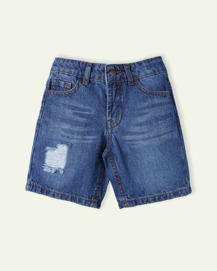 Little boys look cool in ripped denim shorts like this one which comes with a ripped patch at the front along with whiskers. We have also added a printed pocket at the back for a beachy look. - Machine wash cold - 100% Cotton - Whiskers - Printed Back Pocket