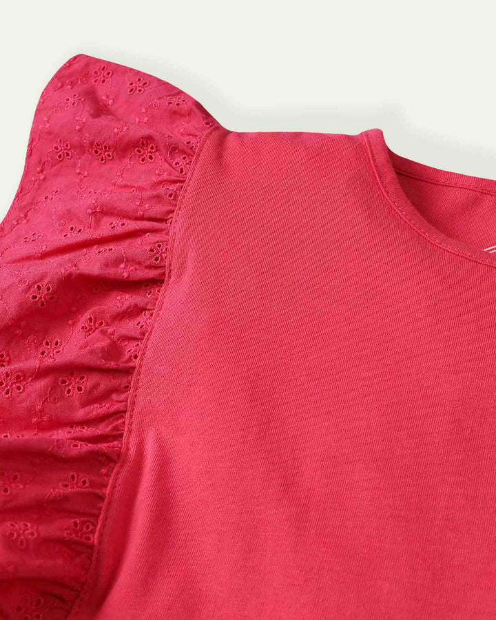 Never a dull moment in our bright pink top that comes with big ruffles in chikan fabric on the shoulders for you to feel the summer breeze on a summer day. The soft cotton texture keeps you comfortable all day. – Machine wash cold – 100% Cotton – Ruffles