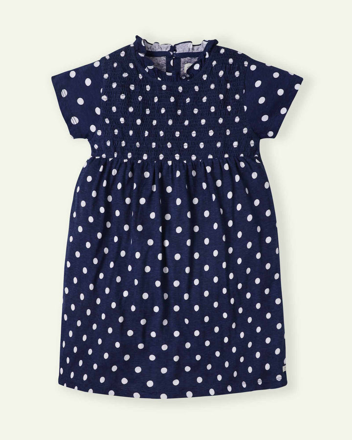 Smocking and polka dots make a perfect pairing for a nice and breezy summer dress. This one has a frilled neckline and a buttoned down back for easy wear. – Machine wash cold – 100% Cotton – Smocking – Branded Hopscotch Buttons – Frilled Neckline