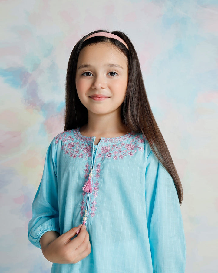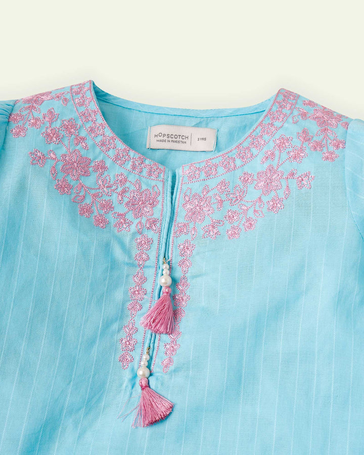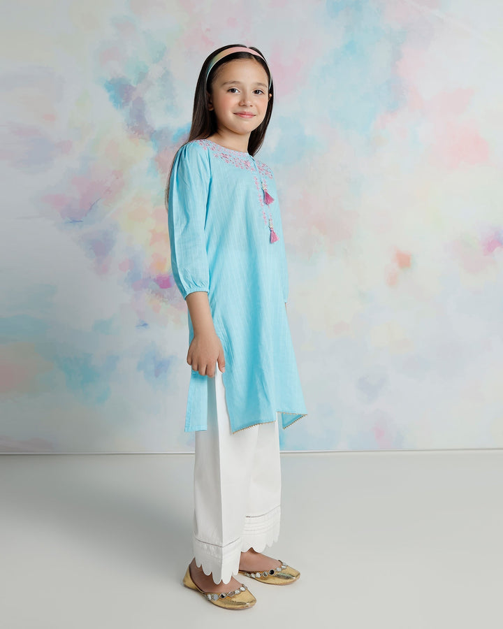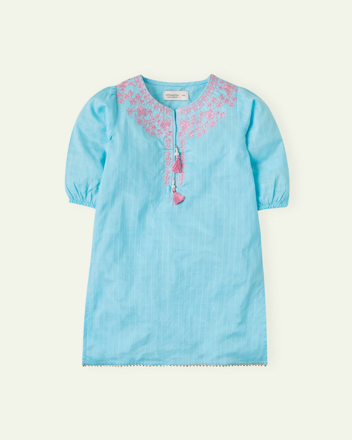 Pretty blue tunic with delicate embroidery around the neckline, dangling tassels and lace around the hem. Straight fit shirt with elasticated sleeves. - 100% Cotton - Machine Wash Cold