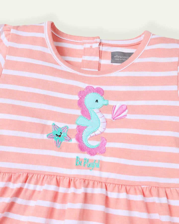 Little girls love stripes and seahorses so we brought them together to make this cute enchanting dress. The striped pattern comes with embroidery for a pop of color. – Embroidery – 100% Cotton – Machine Wash Cold