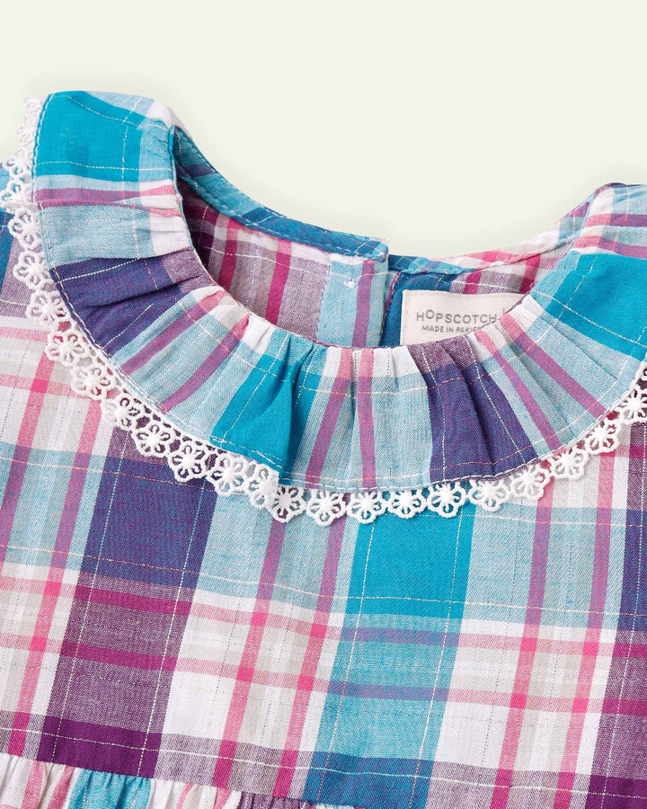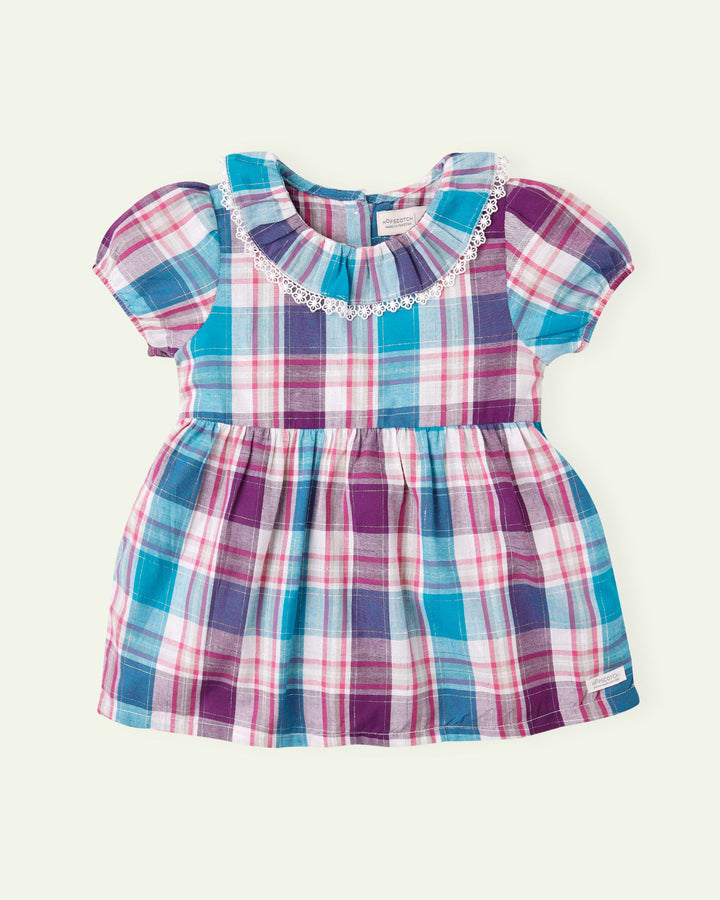 This adorable checkered top for little girls features a charming frilled neckline and cap sleeves with elastication. – Lurex – Frill – Lace – Cap Sleeves – 100% Cotton – Machine Wash Cold