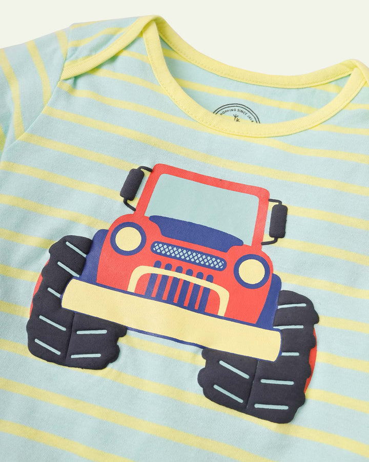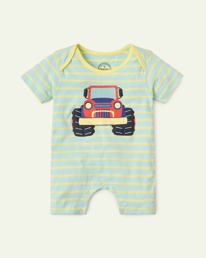 Let the little ones enjoy their adventures in this soft cotton romper with bright yellow finishing. – Puff Printing – 100% Cotton – Snap Buttons – Machine Wash Cold