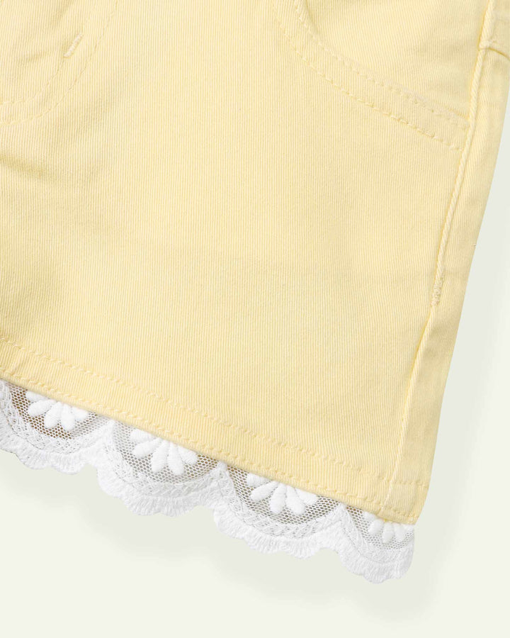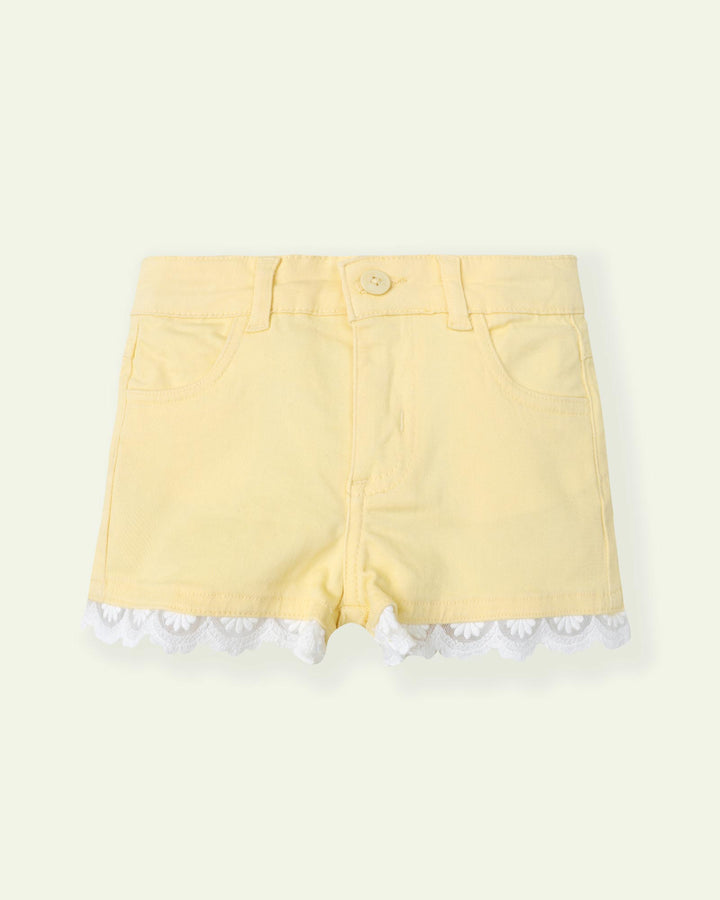 These twill shorts are a blast of fresh colors and summer vibes. They come with a net lace on the hems to add a whimsical touch. – Twill – 100% Cotton – Machine wash cold
