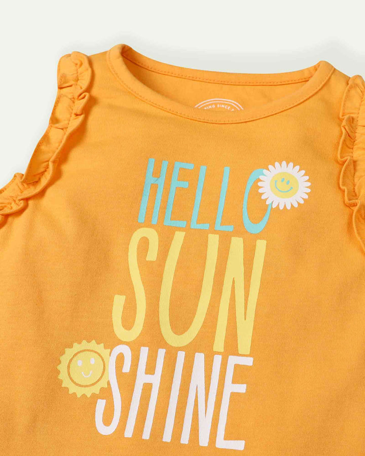 Step into the bright sunshine with a big smile and a cute and bright tank top. It comes with frill on the shoulders and screen printing on top. – Machine wash cold – 100% Cotton – Screen Printing – Frill